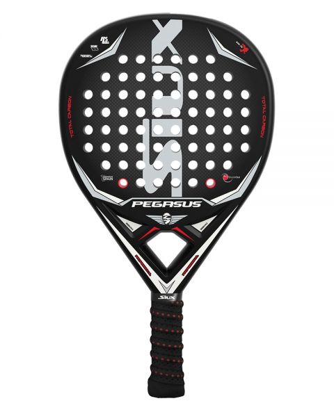 Raquette Siux Pegasus, l'une des plus puissantes de la nouvelle collection. C'est une raquette polyvalente et versatile grâce à sa forme de goutte inversée et son équilibre moyen. Parmi ses caractéristiques, citons l'incorporation d'un pont en forme de diamant qui réduit les vibrations et la double couche de carbone sur les faces. Elle comprend du graphène et une gomme EVA Soft laminée pour une plus grande durabilité.