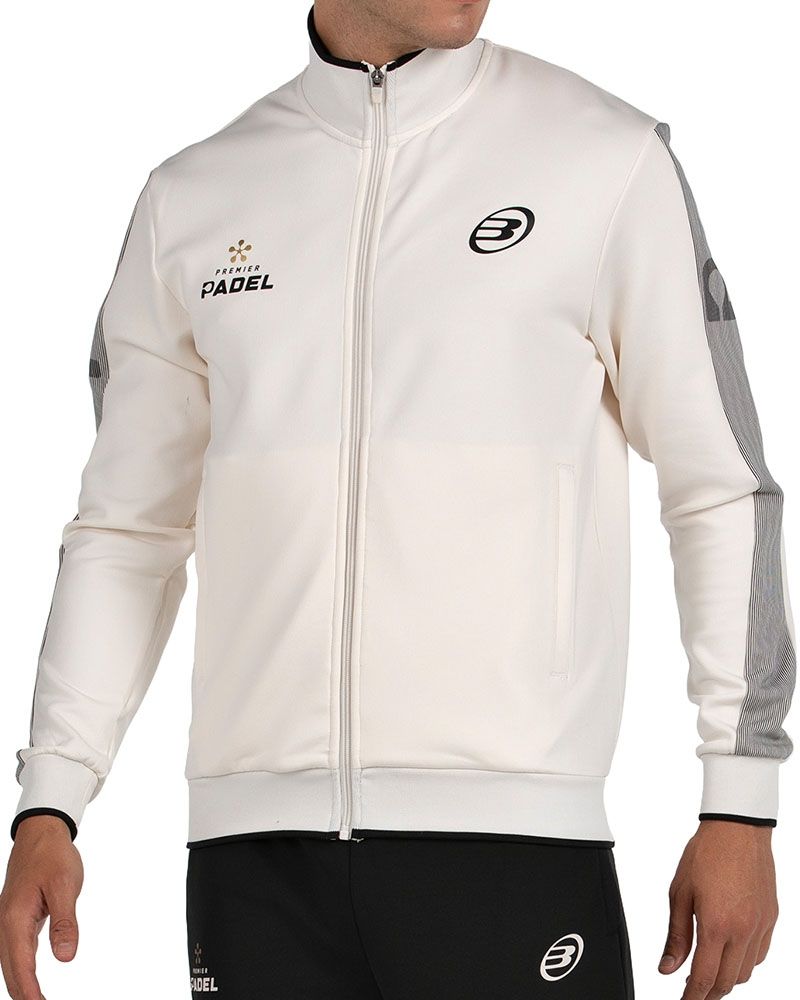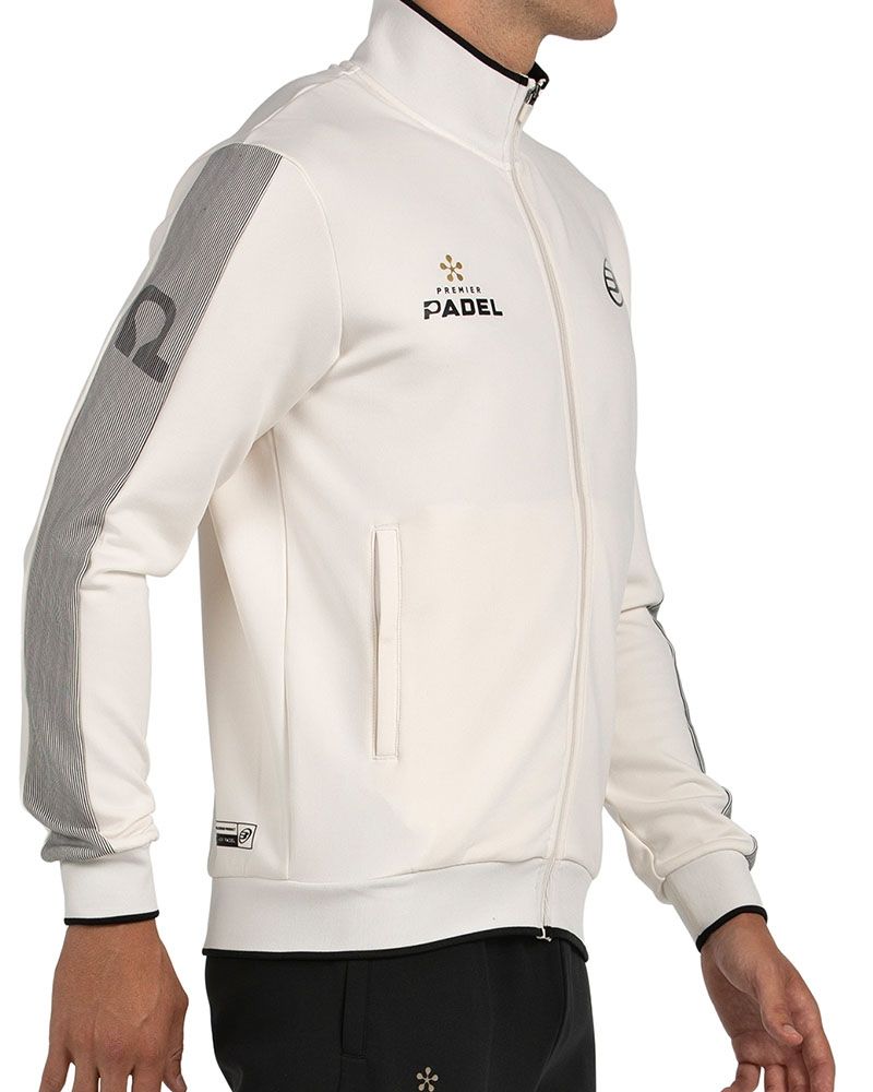 Les finitions en bord-côte bicolore au niveau du col, des poignets et du bas offrent un ajustement ferme et une touche esthétique distinctive. De plus, elle dispose de poches frontales zippées, idéales pour ranger des objets personnels en toute sécurité. Les bandes graphiques personnalisées sur les manches accentuent son style sportif, tandis que les emblèmes officiels de Premier Padel lui confèrent une finition Premium.