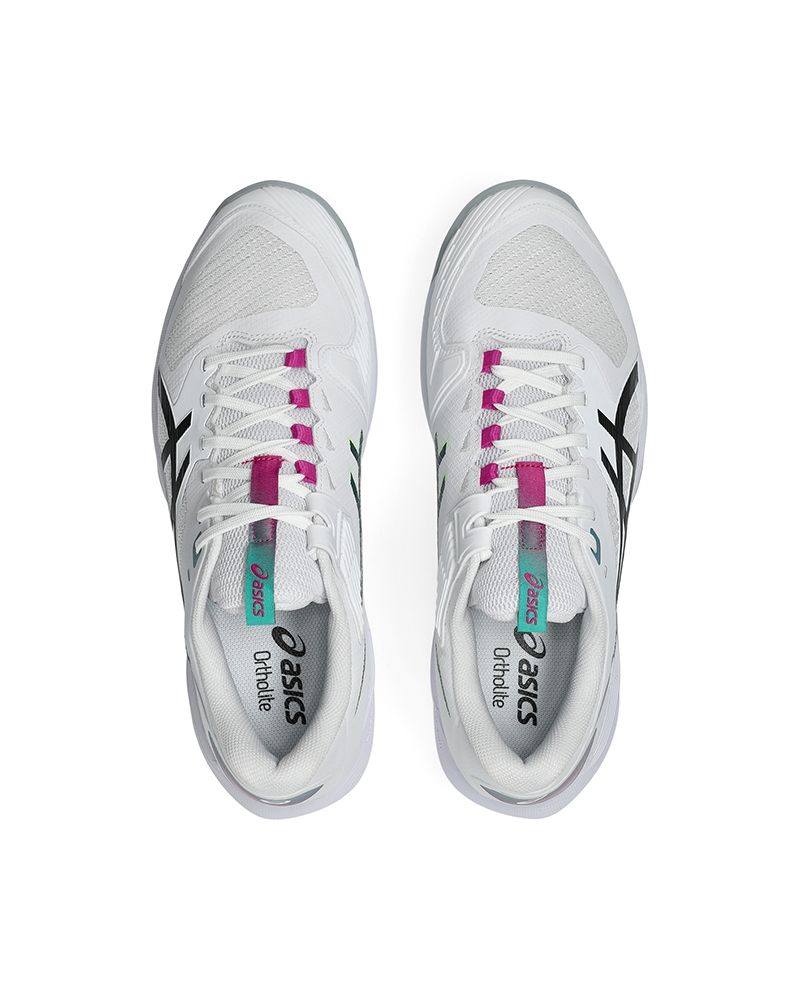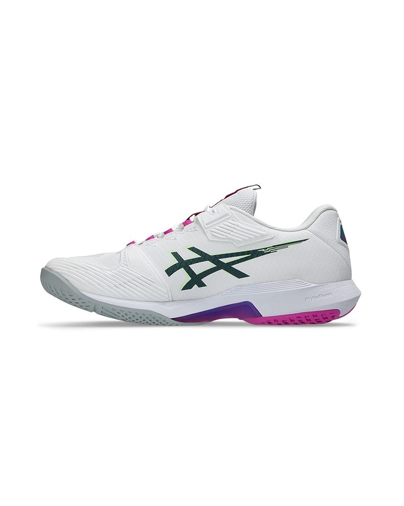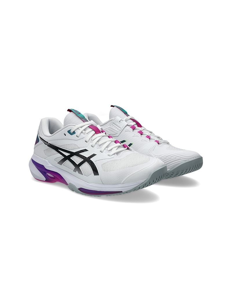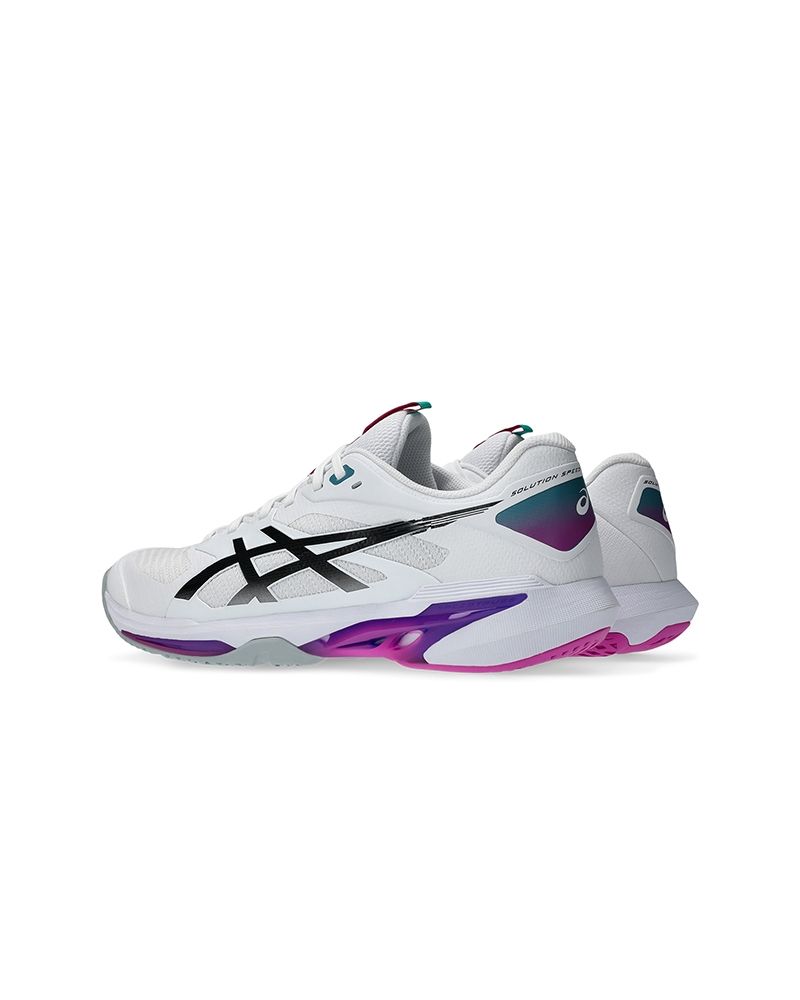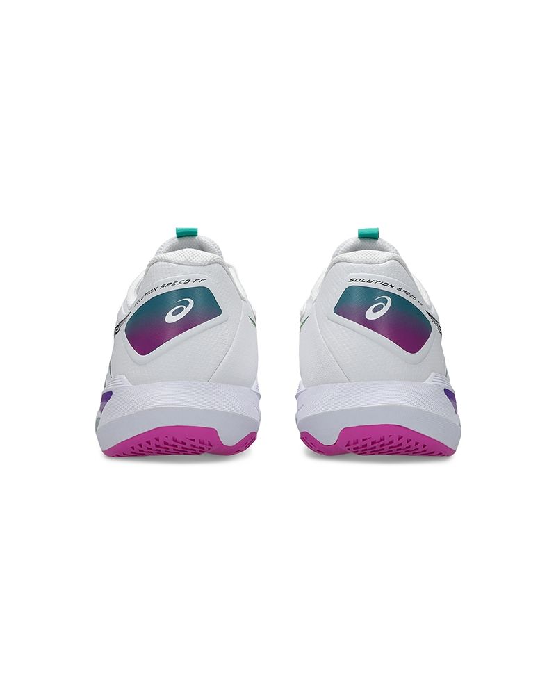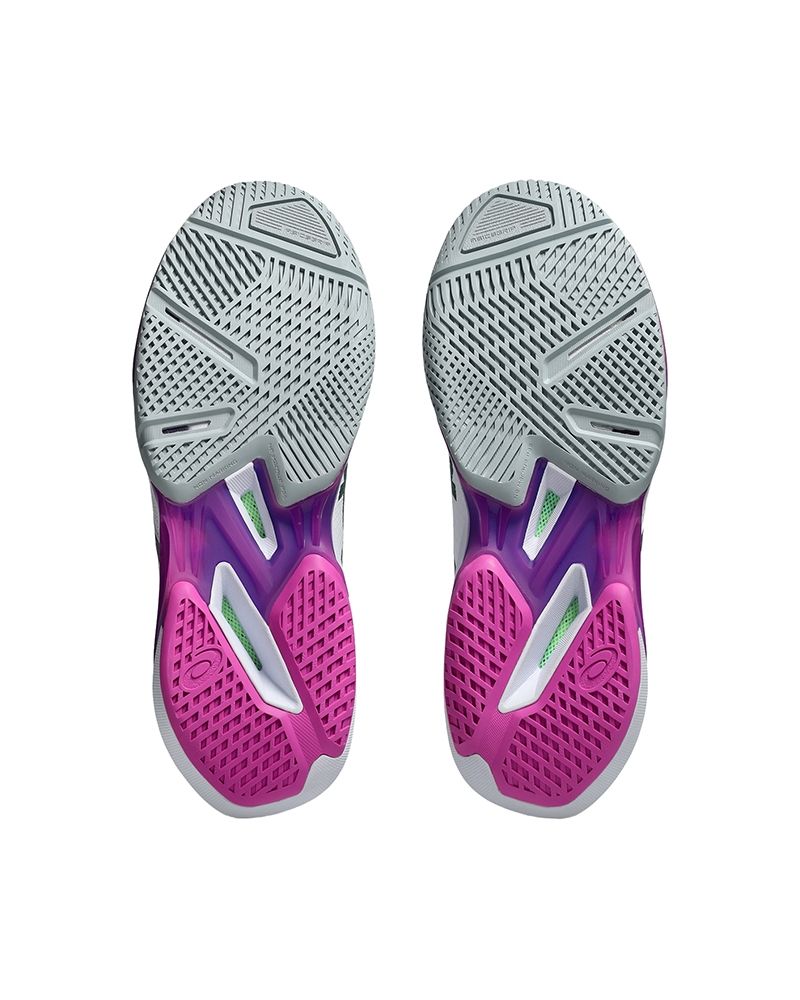 Le Solution Speed Ff 4 in Bianco/Lilla di Asics sono progettate per offrire una trazione precisa e una velocità massima in pista, senza compromettere la stabilità né il Confort.