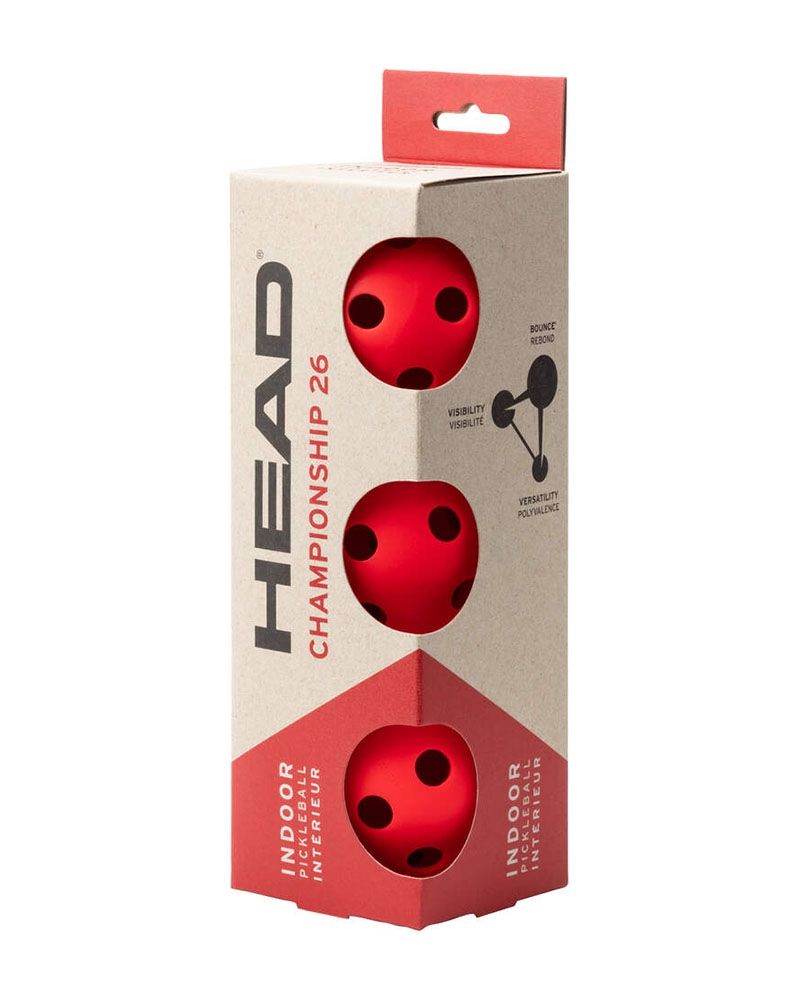 Scopri la Confezione da 3 Palline da Pickleball Head Championship 26 Indoor di colore rosso, appositamente creata per offrire un gioco uniforme e dinamico su campi coperti.
