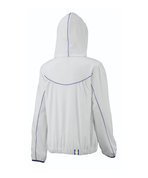 Chaqueta Wilson de mujer con capucha, blanca con costuras, cremallera y detalles de color violeta,muy fresca y ligera.