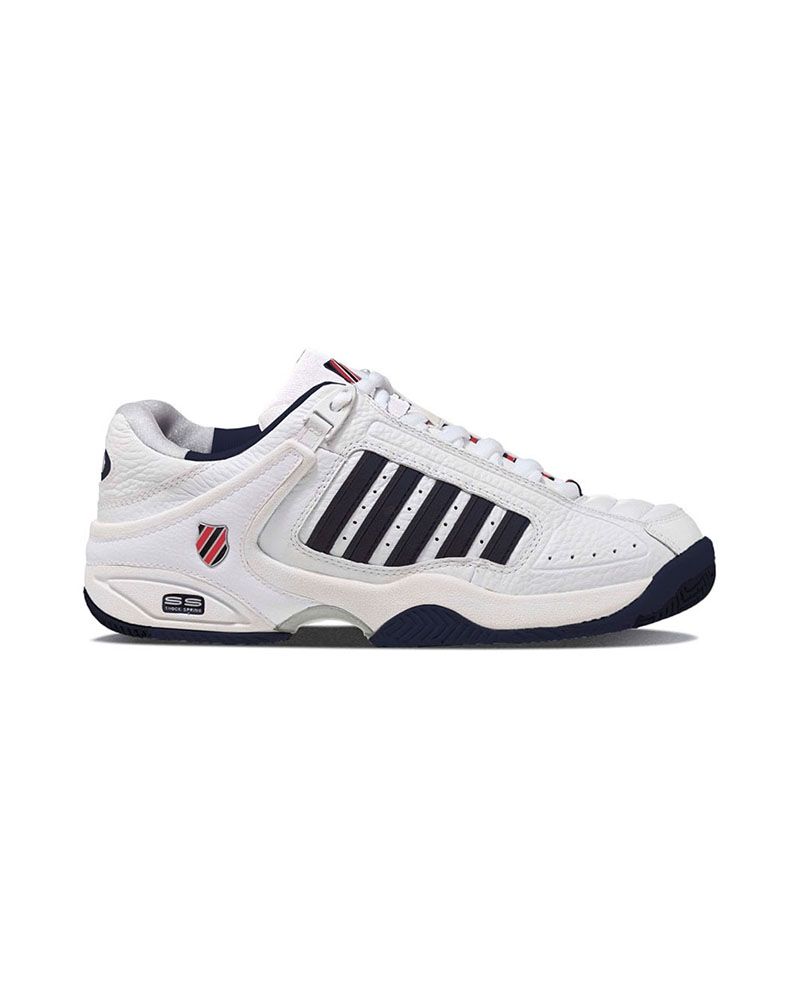 La struttura esterna presenta un elegante colore bianco opaco con dettagli in blu navy. Nella parte posteriore dei lati si trova l'emblematico scudo bicolore di K-swiss.