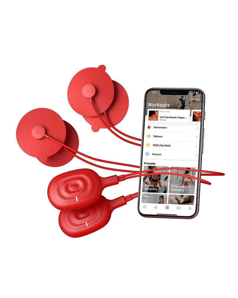 Scopri il PowerDot Duo Red 2.0 di Therabody, un avanzato stimolatore muscolare che utilizza impulsi elettrici per attivare i tuoi muscoli e potenziare le tue prestazioni fisiche.