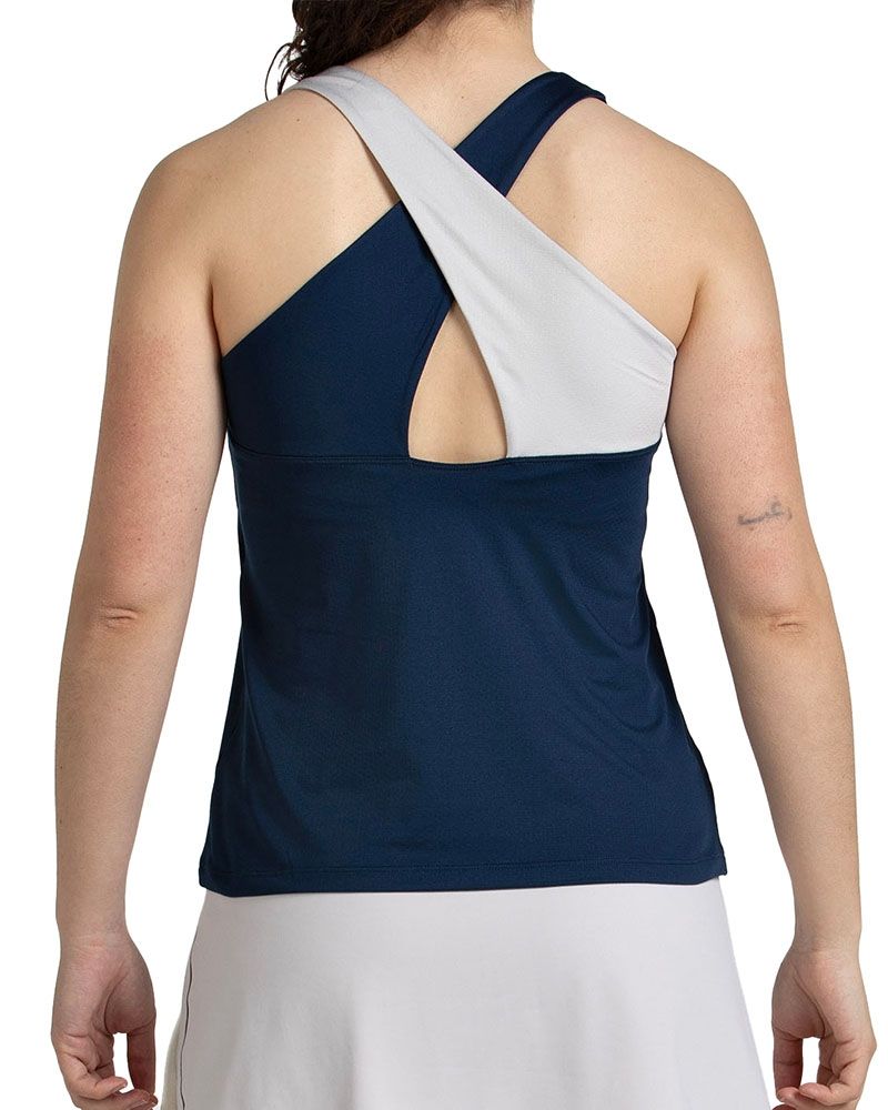 - Le spalline incrociate sulla schiena, in un colore a contrasto, aggiungono un tocco distintivo e pratico.