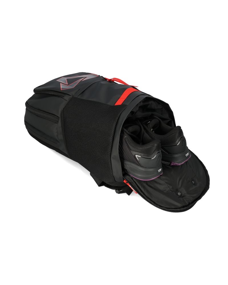 Su diseño elegante en negro con detalles en rojo le da un toque moderno y deportivo, ideal tanto dentro como fuera de la pista. Gracias a su distribución eficiente del espacio, podrás llevar todo tu equipo bien organizado, evitando inconvenientes y facilitando el acceso a cada compartimento cuando más lo necesites.