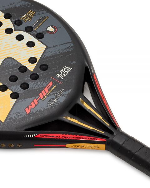 Esta pala de Royal Padel está diseñada con núcleo de polietileno y las caras en fibra de vidrio aluminizadas. El marco tubular Fibertech es bidireccional, en fibra de vidrio, con refuerzos de carbono. La superficie Rough Surface aporta una excelente respuesta en el control de los golpeos. Destaca de esta pala el Shock Absortion, un sistema que reduce las vibraciones, lo que minimiza lesiones como la epicondilitis. Además, esta nueva pala mejora el control y precisión en cada golpeo. Absorbe los impactos y mejora la comodidad durante el juego. Cuenta con el sistema Core Tech, enfoque innovador en el diseño y construcción del núcleo. Mejora la potencia, control y durabilidad. La Whip Extreme es la pala más cómoda de la gama Royal Padel.