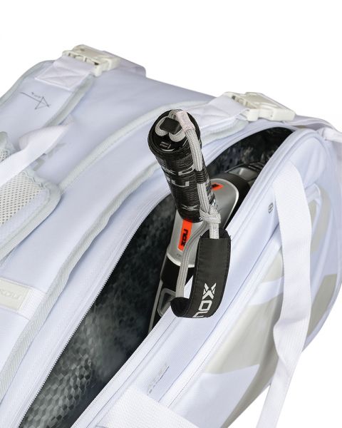 Descubre el Paletero Nox AT10 Team en blanco, una pieza esencial para cualquier jugador de pádel que valore tanto la calidad como el diseño. Este modelo, creado para el reconocido Agustín Tapia, el Mozart de Catamarca, combina elegancia con la máxima funcionalidad. Su compartimento principal, equipado con una doble cremallera, ofrece un amplio espacio para llevar hasta 3 palas, ropa y otros accesorios. El compartimento térmico con capacidad para otras 2 palas, gracias a la innovadora tecnología NOX ThermoTech, asegura que tus palas y bebidas mantengan la temperatura ideal durante todo el partido.