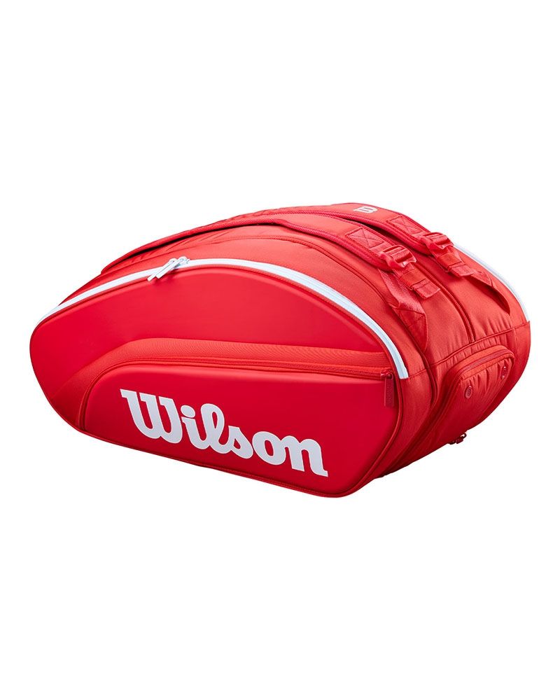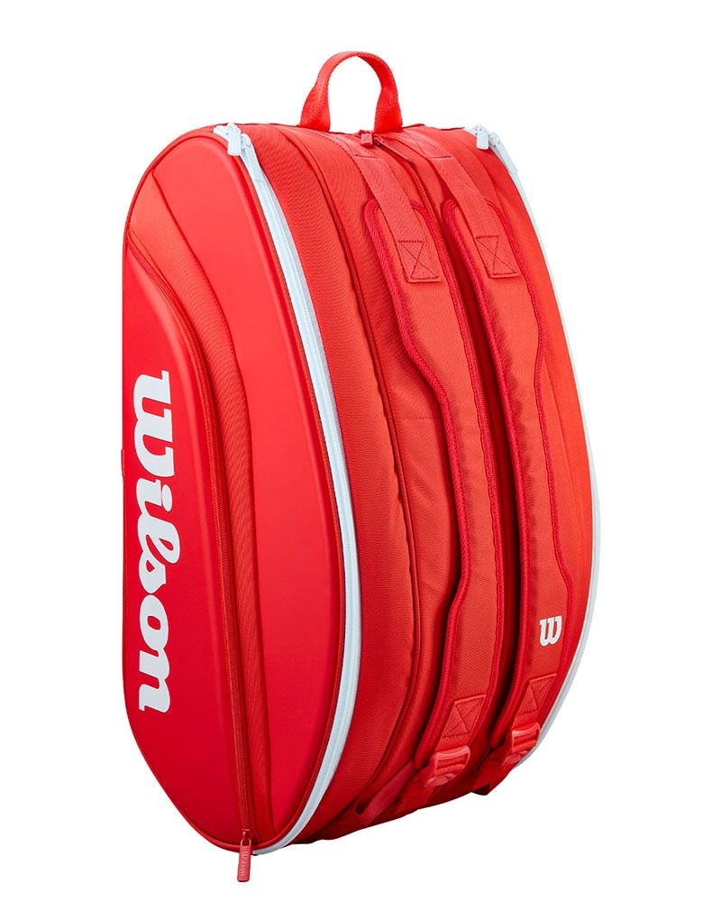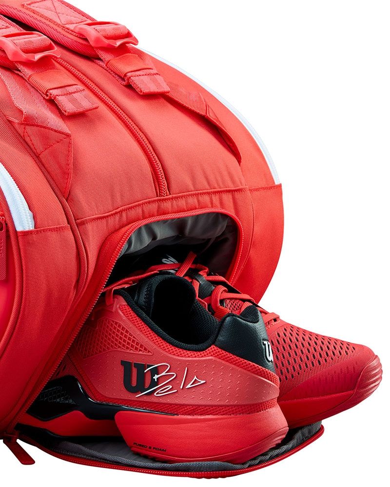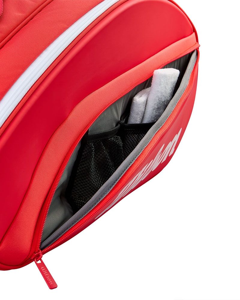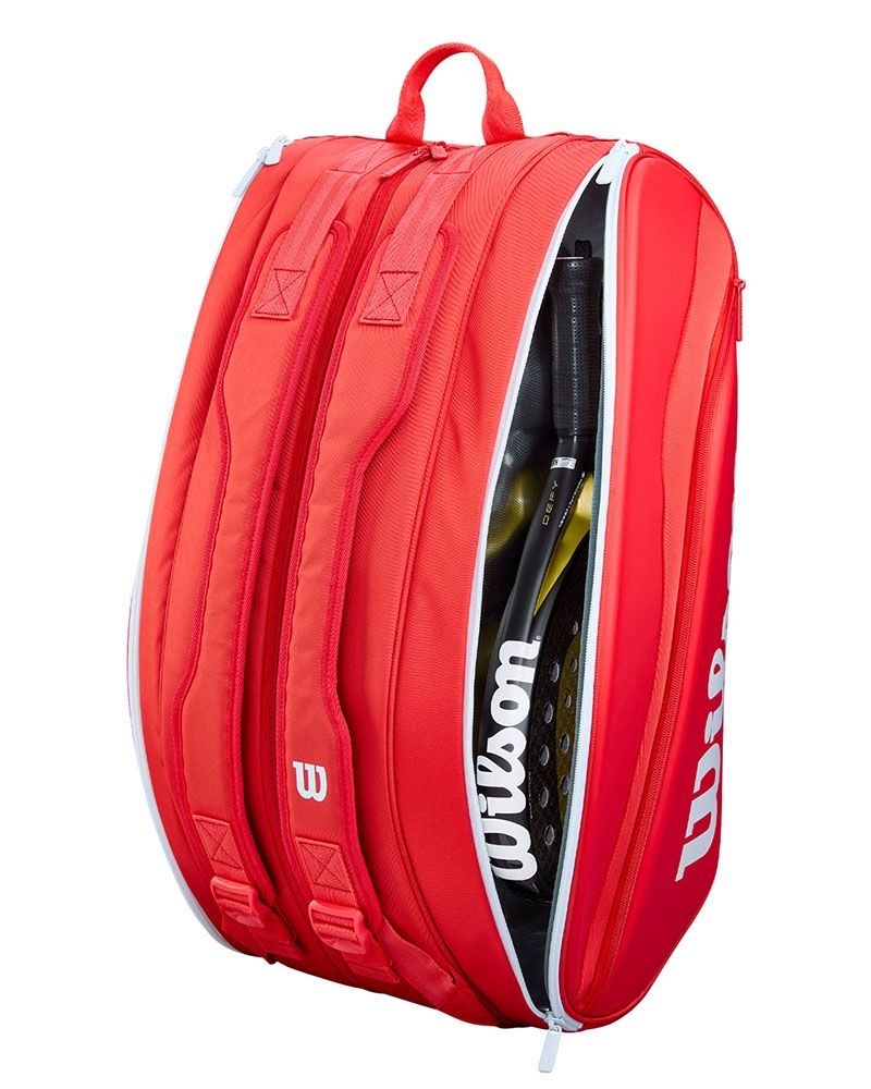 El Paletero Wilson Super Tour Pádel 2026 Rojo está pensado para aquellos jugadores que buscan un amplio espacio de almacenamiento sin sacrificar un diseño moderno y deportivo. Wilson ha actualizado la forma de este modelo, manteniendo sus colores icónicos, para ofrecer un paletero que es tanto llamativo como funcional.