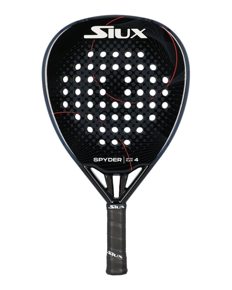 La Siux Spyder 4 Attack Flex es la pala de pádel perfecta para jugadores que buscan un equilibrio entre control y potencia. Su diseño en color negro y rojo potencia los pequeños puntos grises que aparecen en la superficie, destacando también el nombre de la marca en color blanco.