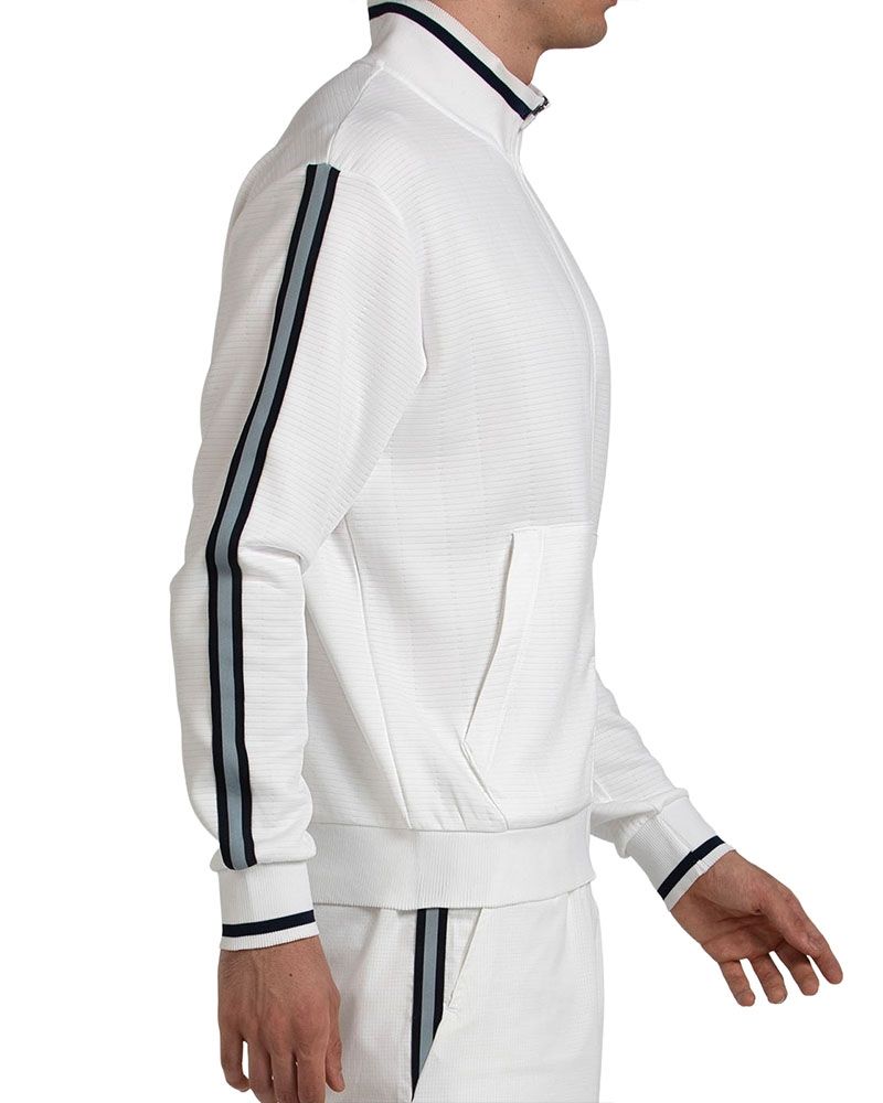 Cuenta con una cremallera central que permite un ajuste y ventilación óptimos, además de bolsillos laterales con cremallera para mantener tus pertenencias seguras. El rib bicolor en el cuello y los puños añade un toque único, mientras que el bajo liso proporciona un acabado elegante.