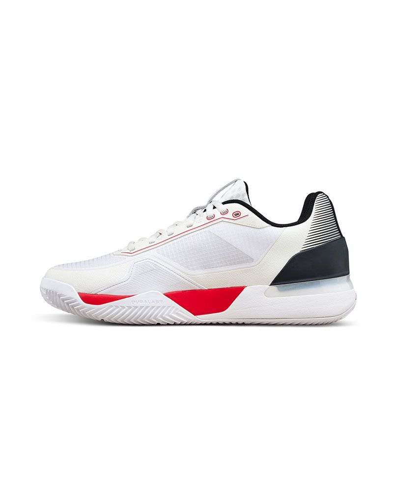 Su diseño en blanco con detalles en rojo no solo es competitivo, sino que también irradia elegancia, reflejando un estilo profesional en la cancha. Diseñadas para partidos intensos, estas zapatillas ofrecen un equilibrio perfecto entre control, potencia y seguridad.
